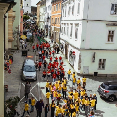 Nach einem Festakt im Turnsaal mit einer Präsentation der Arbeiten der Kinder und Grußworten der Ehrengäste, geht es lautstark und sichtbar in einem Demozug von der Volksschule durch die Stadt zum Frauenteich. An verschiedenen Plätzen in der Stadt wird Halt gemacht, um durch kleine Aktionen auf das Thema Klimaschutz aufmerksam zu machen.