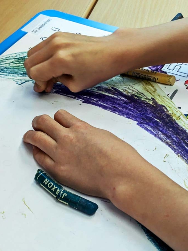 Wir befinden uns im „Reich der Fantasie“ als Grundhaltung in der Arbeit mit den Kindern. Sie ist wichtig bei der kunsttherapeutischen Themenfindung, alles ist möglich! Es gibt kein richtig oder falsch! Die eigenen Eindrücke werden anschließend mit leuchtenden Ölkreiden auf Papier festgehalten. Eindrucksvolle, kreative Bilder entstehen.