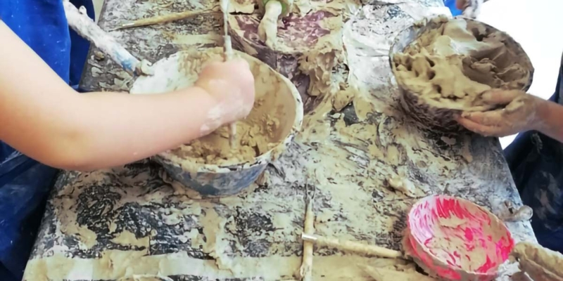 An weiteren Projekttagen finden die Schülerinnen und Schüler als Basis für die Weiterarbeit eine vorbereitete Umgebung für das plastische Gestalten vor. Sie dürfen eine Landschaft aus Ton gestalten und sammeln dabei vielfältige Erfahrungen mit dem Material Ton. Teamwork ist gefragt, der Austausch von Ideen ist erwünscht.
