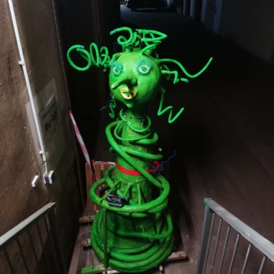 Diese Spirulina hält im Rahmen der Feier eine „performative Rede“. Die Grünalge spricht über die Wichtigkeit von innovativen Ideen, um gegen den Klimawandel anzugehen und von neuen Möglichkeiten aus der Forschung zu Algen. Dann wird erstmals die Wasserpumpe eingeschaltet und es plätschert blaues Wasser aus dem Mund der Spirulina in einen Glaskubus am Körper.