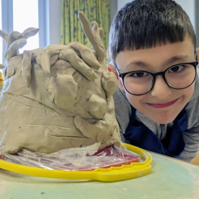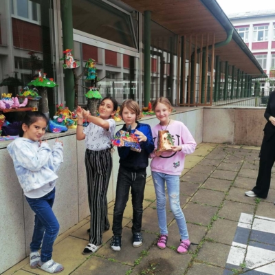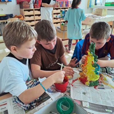 In dieser Phase bauen und entwickeln die Kinder in Teams oder allein Figuren/ Plastiken zu ihrem Thema. Ihre Zeichnungen, die sie nach der Fantasiereise angefertigt haben, dienen dabei als Basis: Gemeinsam mit der leitenden Künstlerin werden die Zeichnungen besprochen, wichtige Details werden gesammelt, weiterentwickelt und ev. vergrößert – es entsteht zur Zeichnung ein dreidimensionales künstlerisches Objekt.
