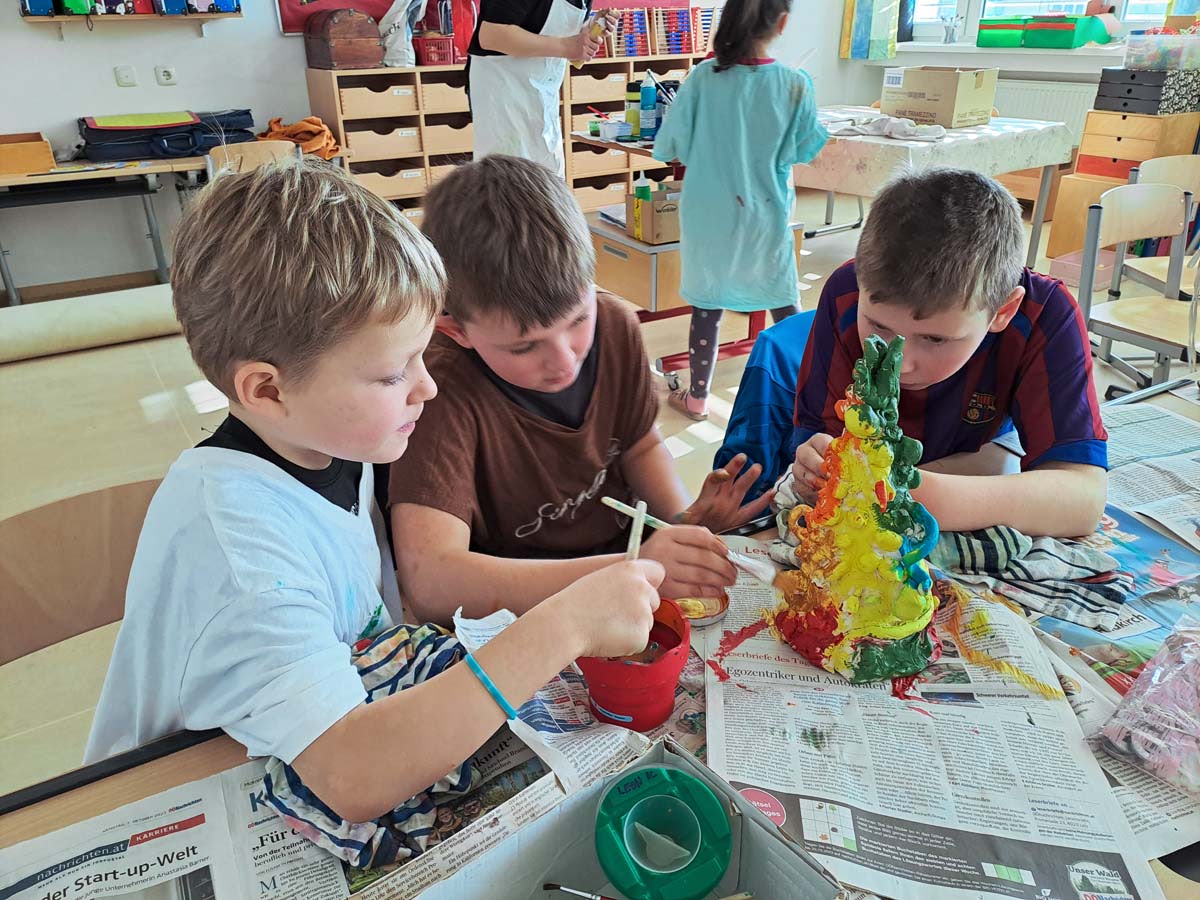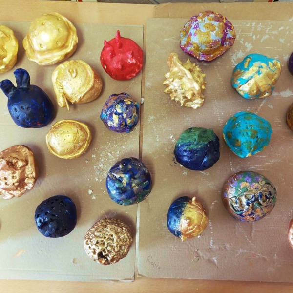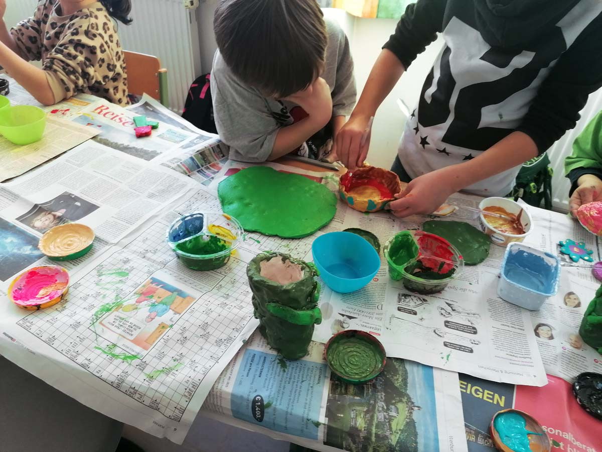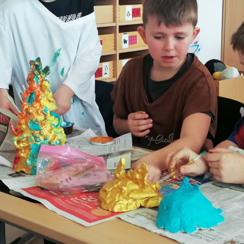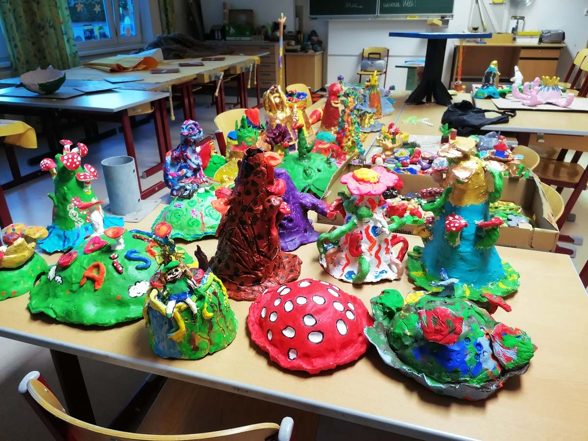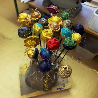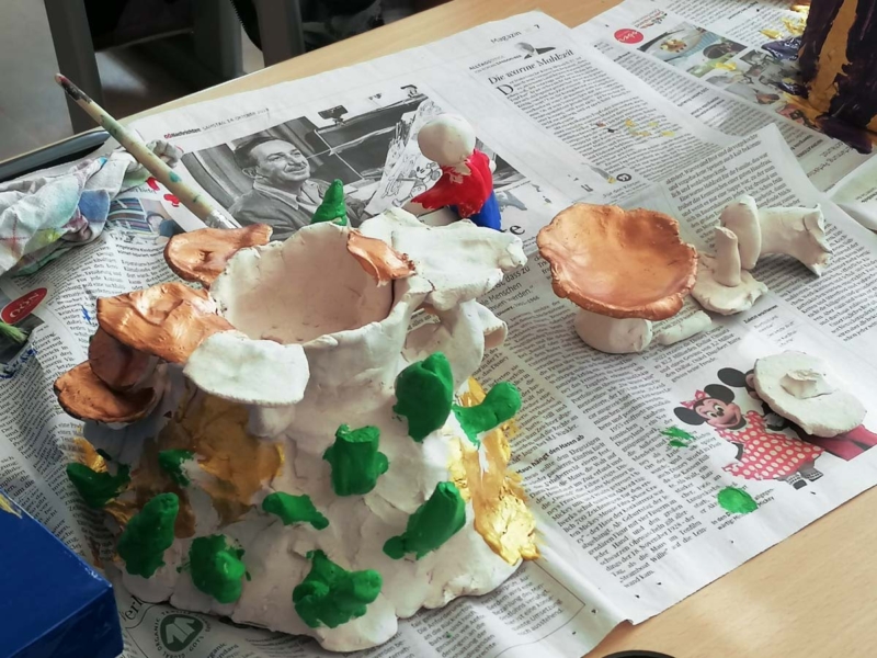 Die Objekte werden mit Acrylfarben angemalt und gestaltet. Es stehen auch Neonfarben zur Verfügung. Diese leuchten besonders schön bei Dunkelheit, sie sind wetterfest und farbintensiv. Dadurch wird ein zauberhafter, magischer Ausdruck der Installation erreicht.