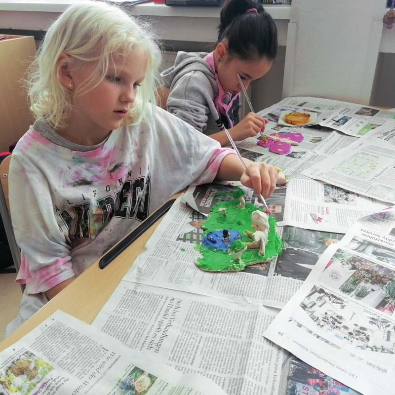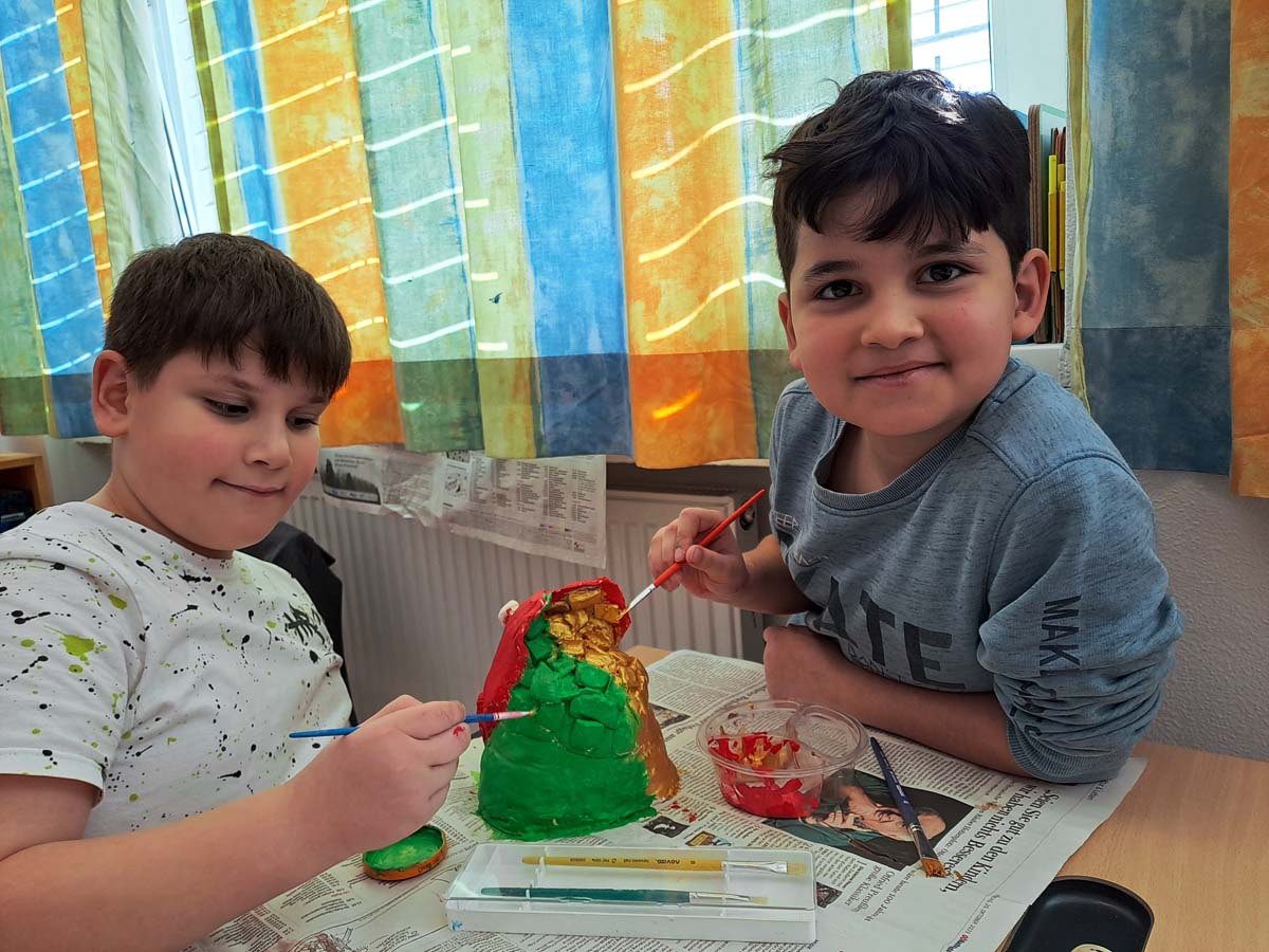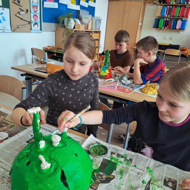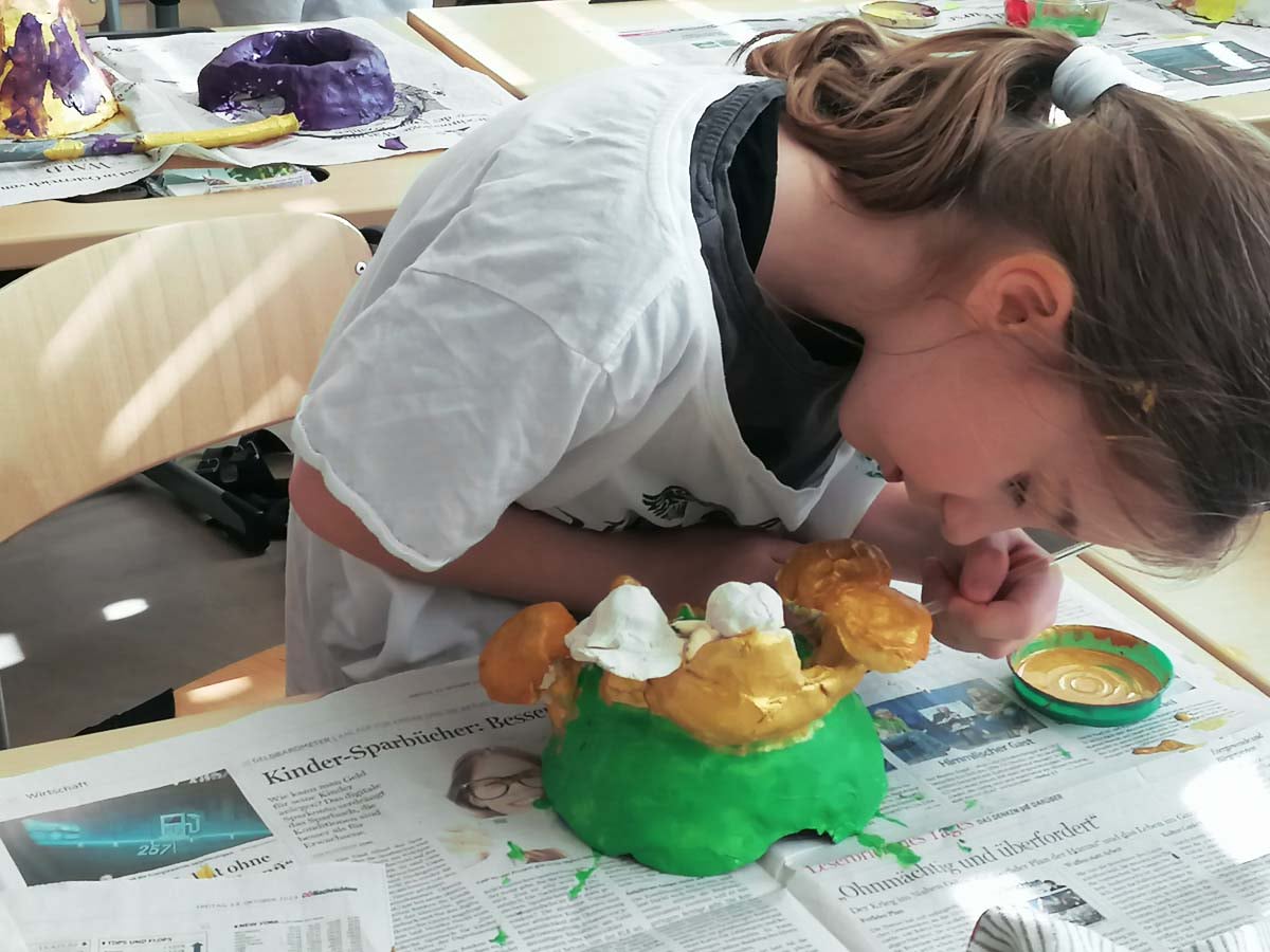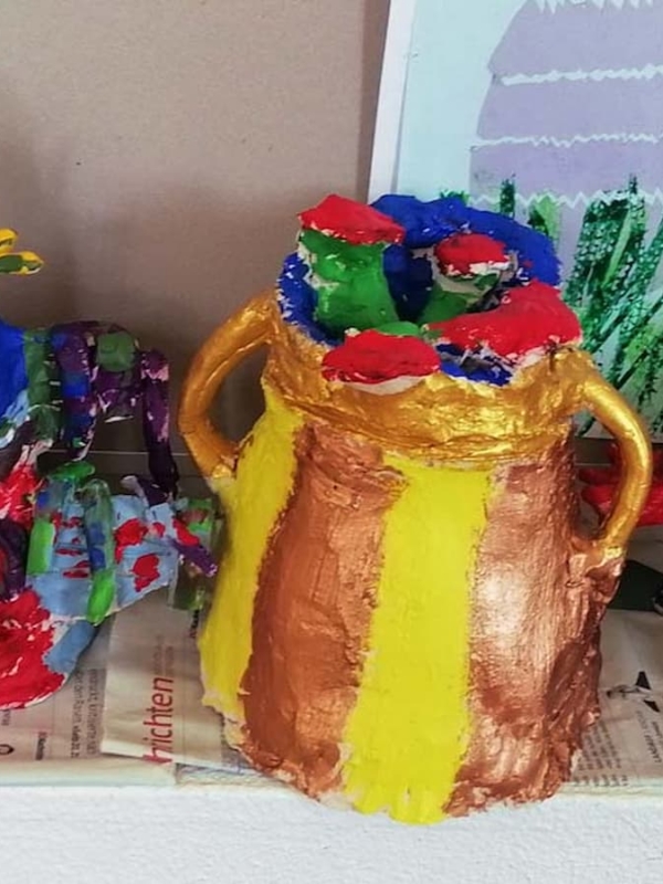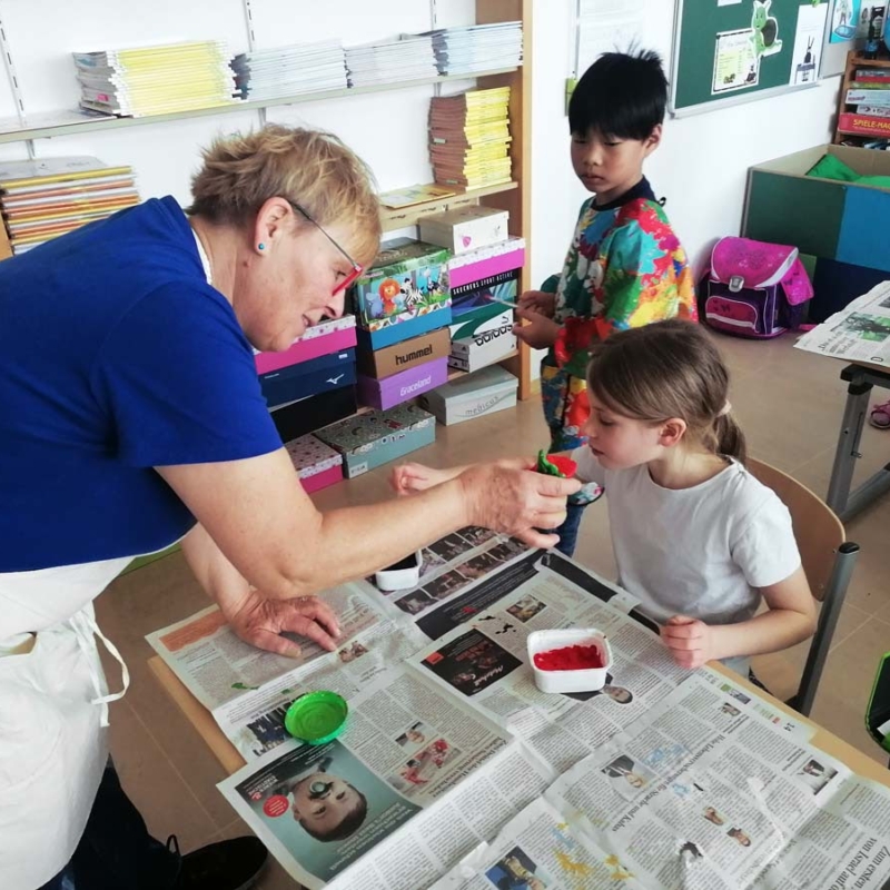 Die Objekte werden mit Acrylfarben angemalt und gestaltet. Es stehen auch Neonfarben zur Verfügung. Diese leuchten besonders schön bei Dunkelheit, sie sind wetterfest und farbintensiv. Dadurch wird ein zauberhafter, magischer Ausdruck der Installation erreicht.