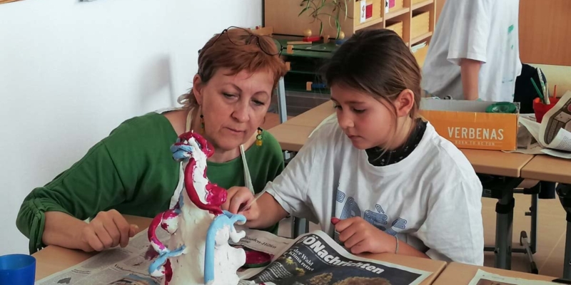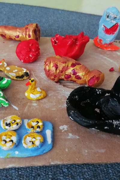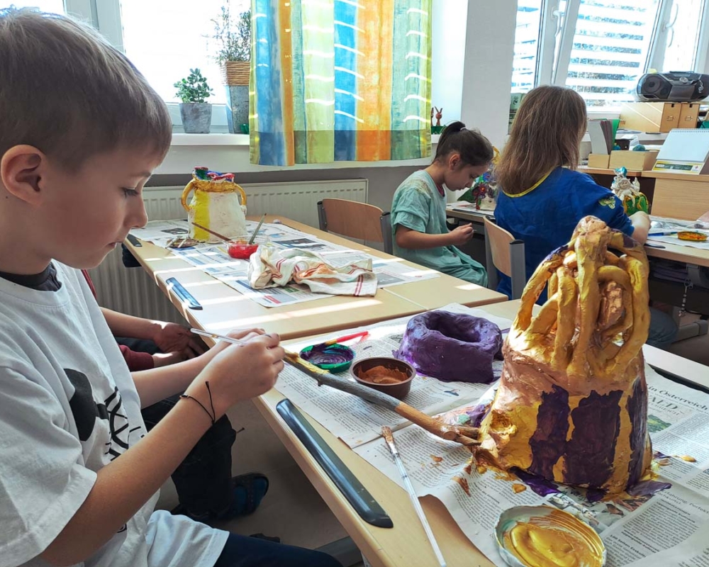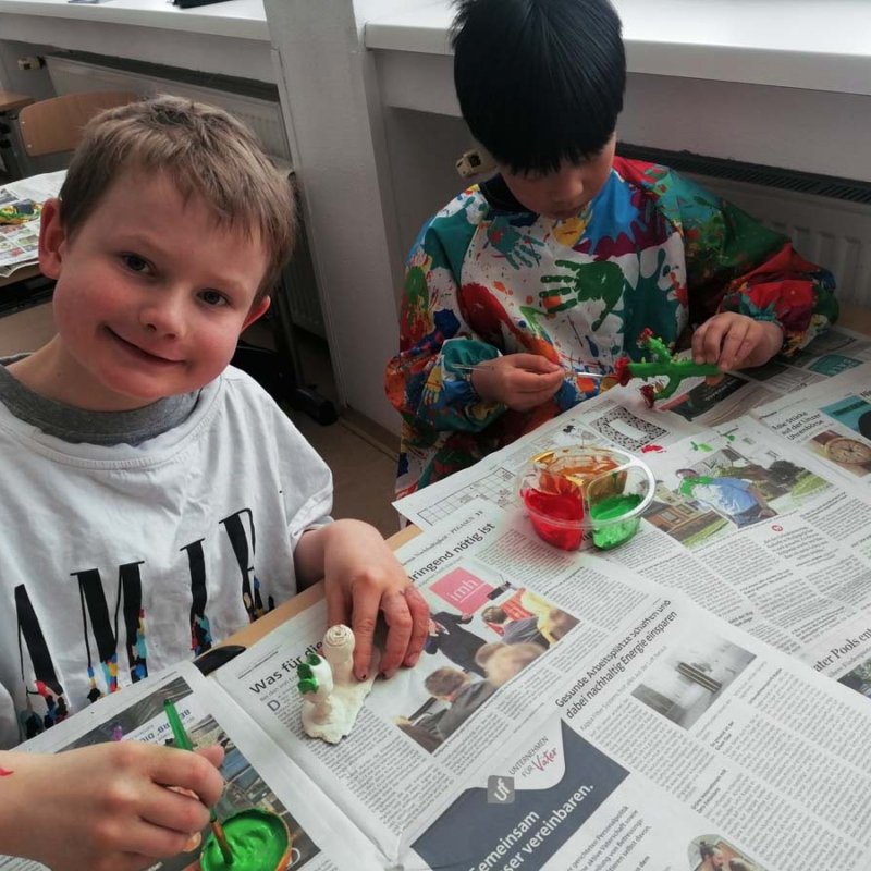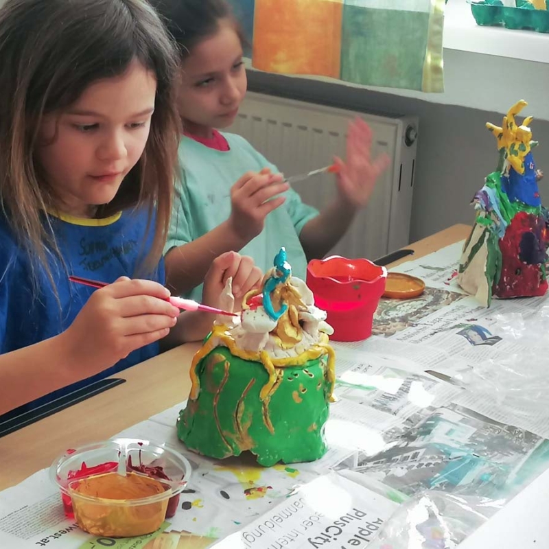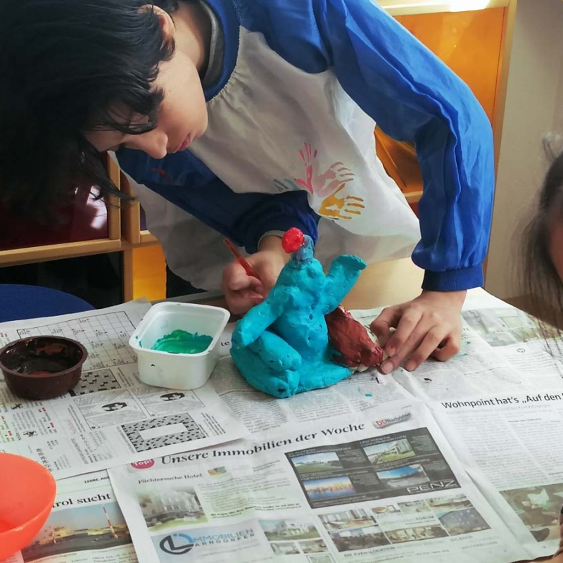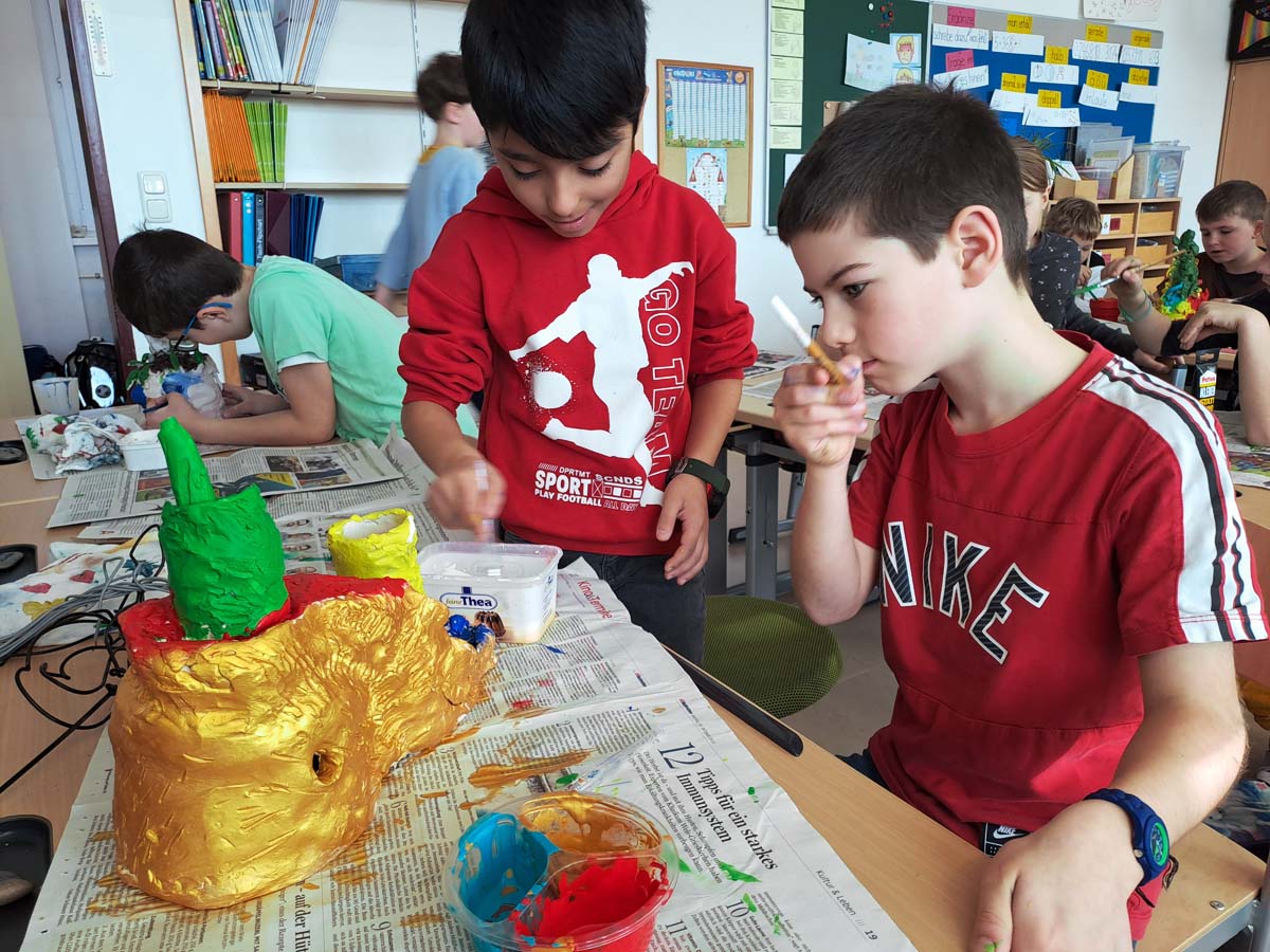 Die Objekte werden mit Acrylfarben angemalt und gestaltet. Es stehen auch Neonfarben zur Verfügung. Diese leuchten besonders schön bei Dunkelheit, sie sind wetterfest und farbintensiv. Dadurch wird ein zauberhafter, magischer Ausdruck der Installation erreicht.