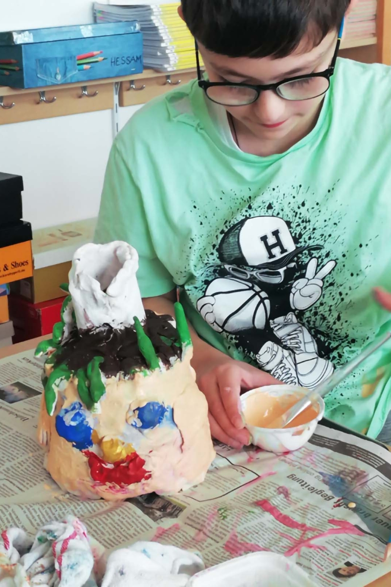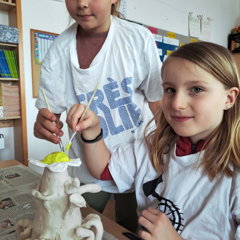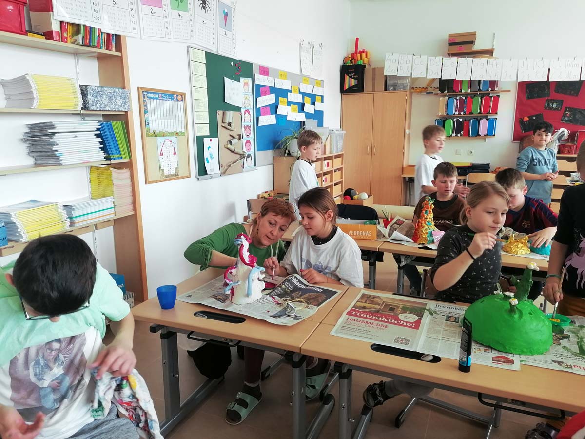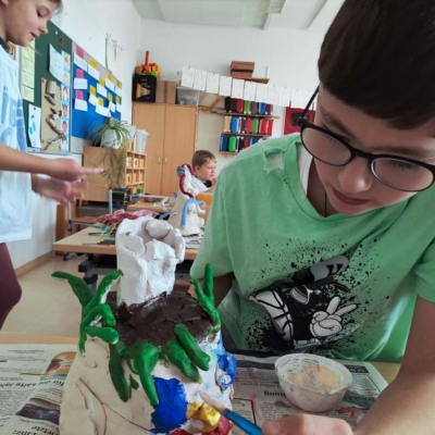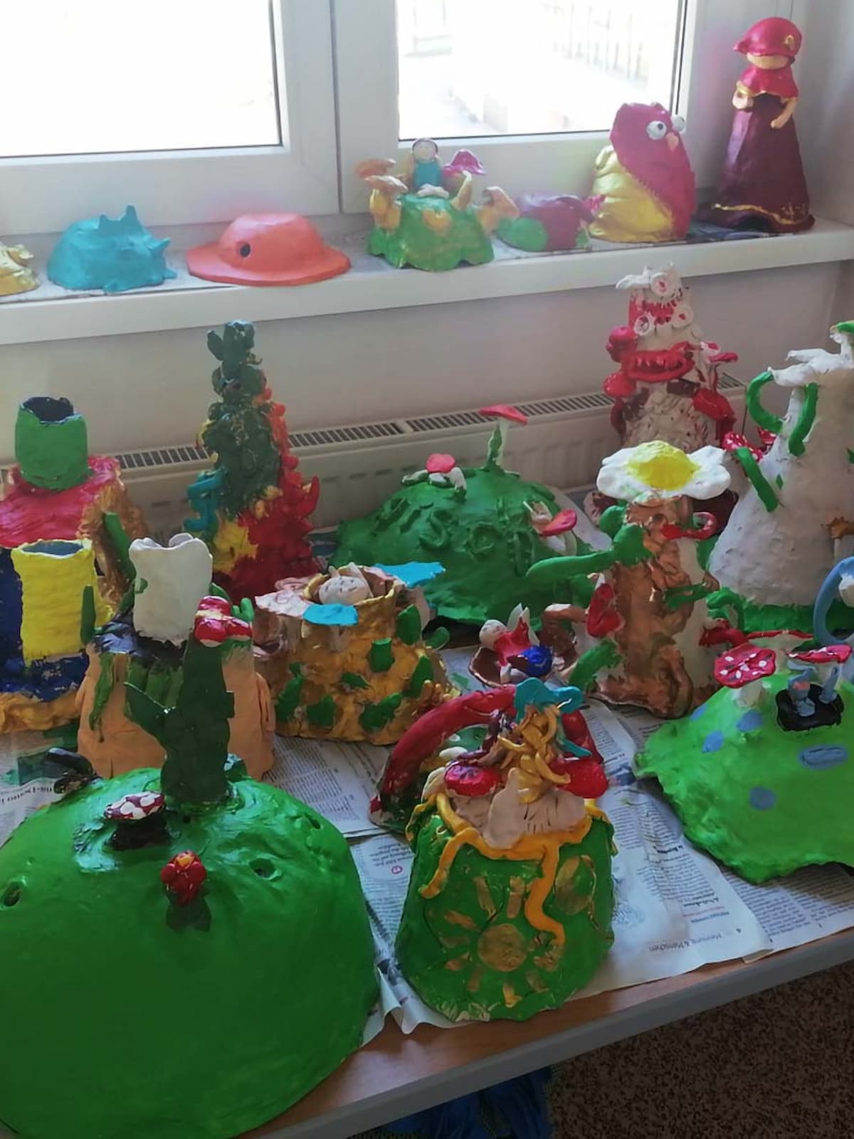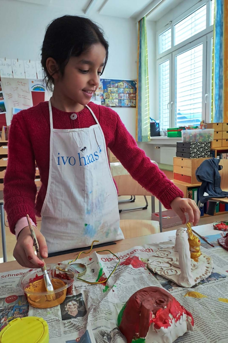 Die Objekte werden mit Acrylfarben angemalt und gestaltet. Es stehen auch Neonfarben zur Verfügung. Diese leuchten besonders schön bei Dunkelheit, sie sind wetterfest und farbintensiv. Dadurch wird ein zauberhafter, magischer Ausdruck der Installation erreicht.