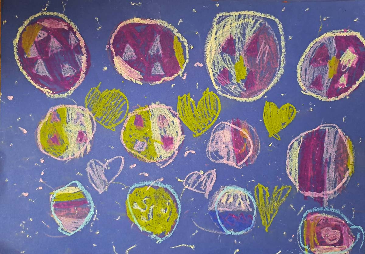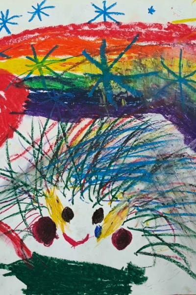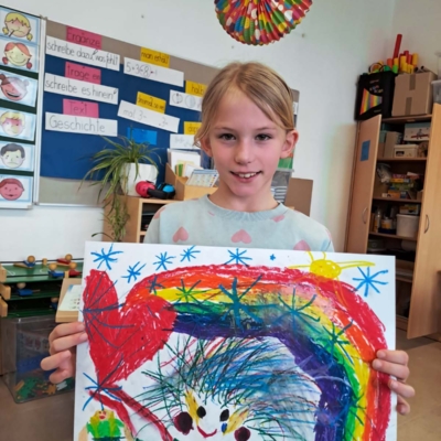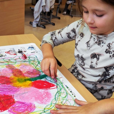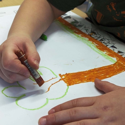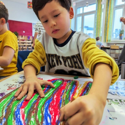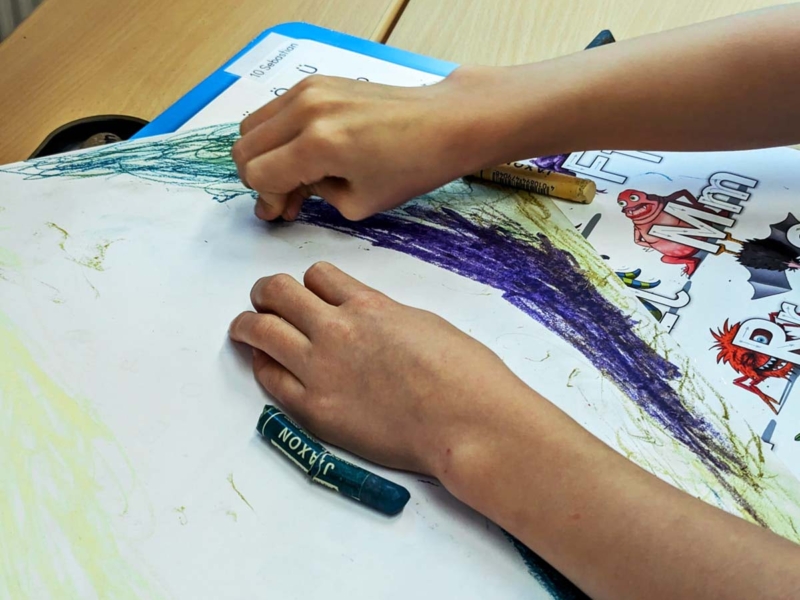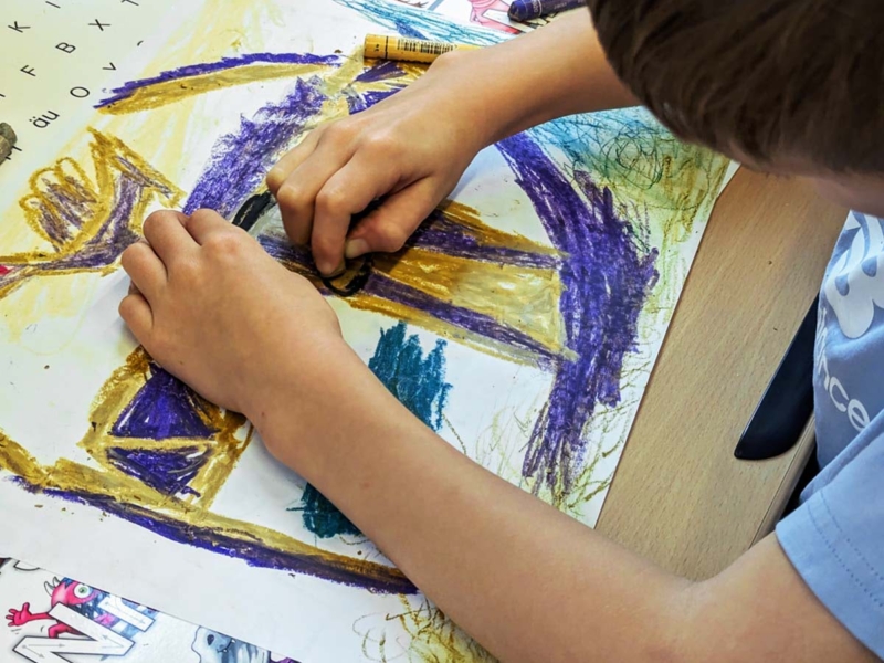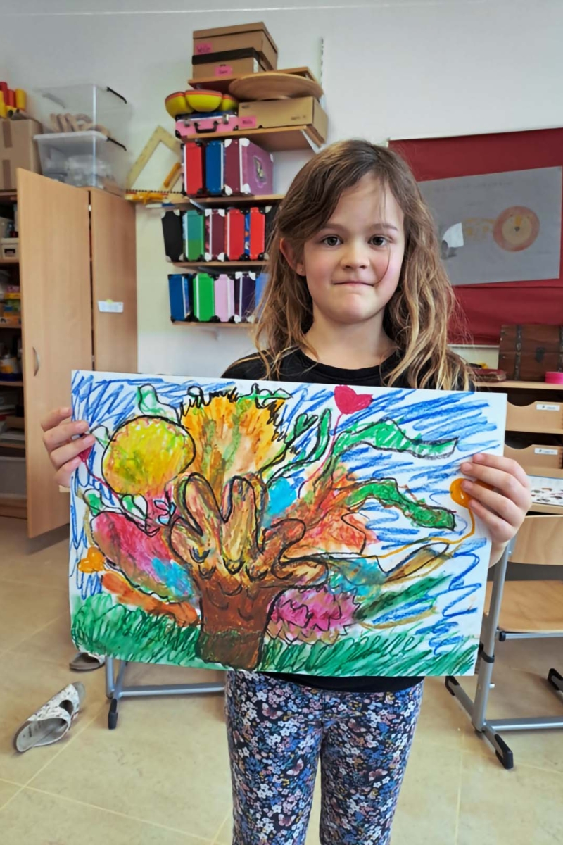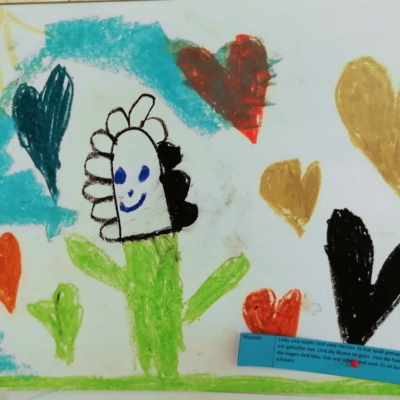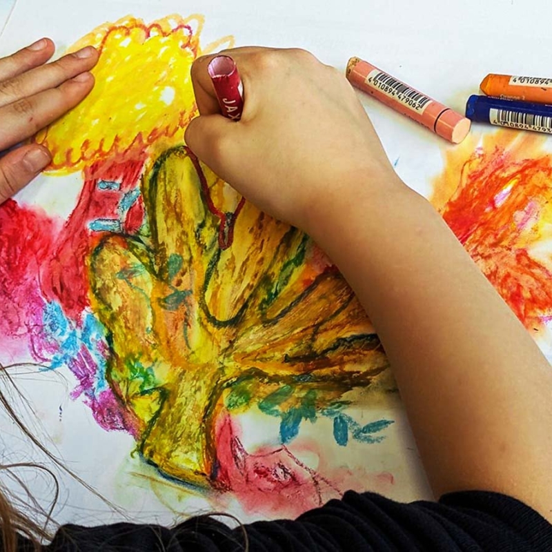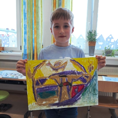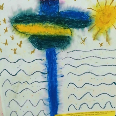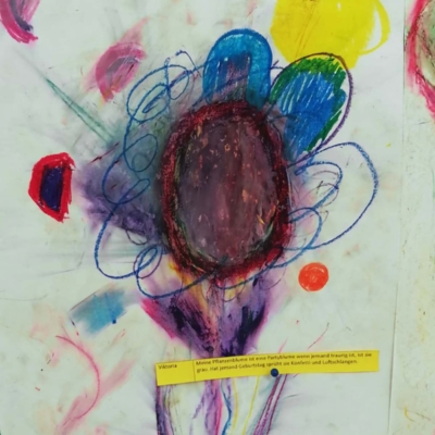 Wir befinden uns im „Reich der Fantasie“, als Grundhaltung in der Arbeit mit den Kindern. Sie ist wichtig bei der kunsttherapeutischen Themenfindung, alles ist möglich! Es gibt kein richtig oder falsch! Die eigenen Eindrücke werden anschließen mit leuchtenden Ölkreiden auf Papier festgehalten. Eindrucksvolle, kreative Bilder entstehen.